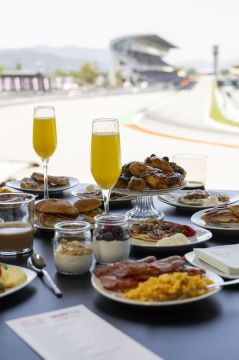 - Access to 2 terraces: A terrace on the same level with panoramic views of the final turn + pit lane entrance, and a lower-level terrace with closer views of the track and F1 cars.